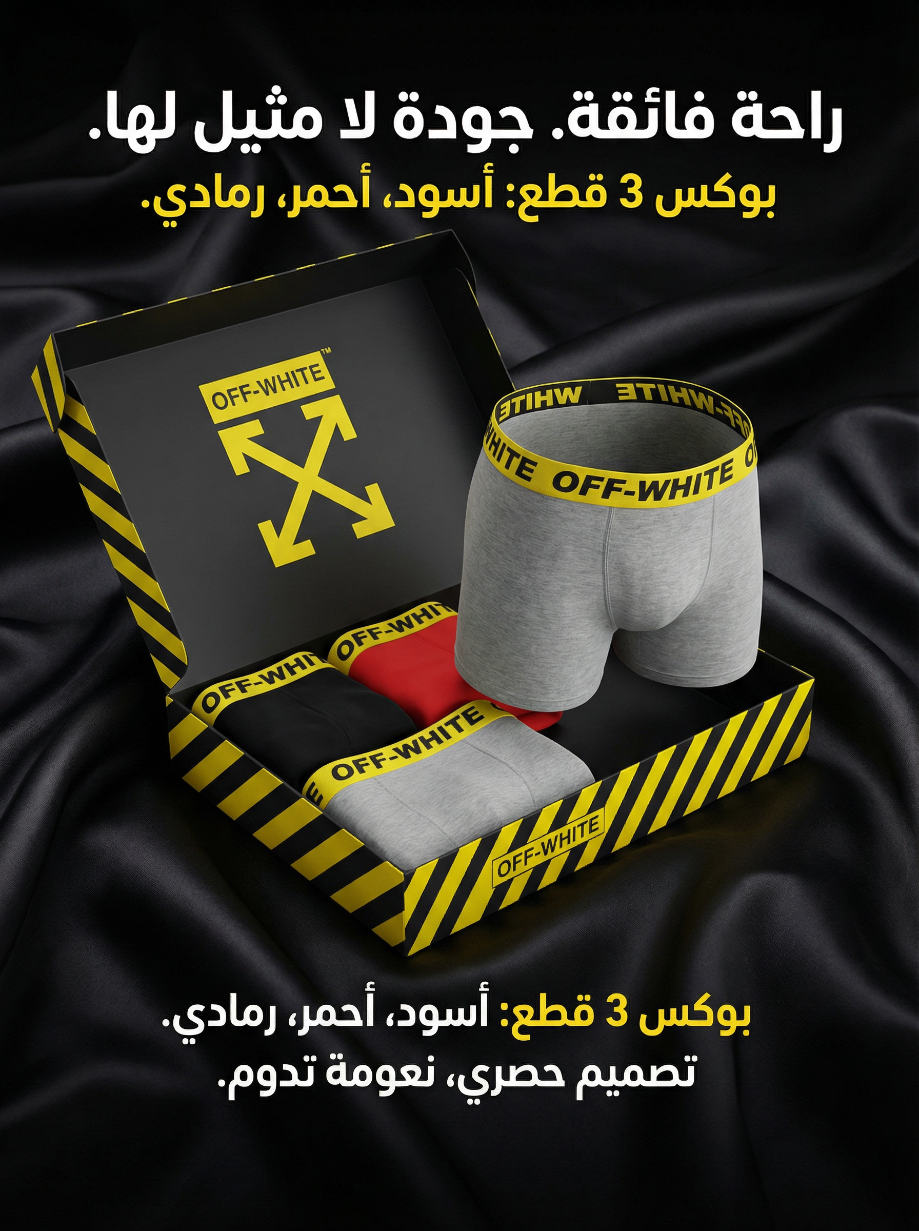 نقدم لك النسخة الأعلى جودة في السوق من بوكسر Off-White الفريد. تصميم استثنائي يجمع بين الموضة الراقية والراحة الفائقة.